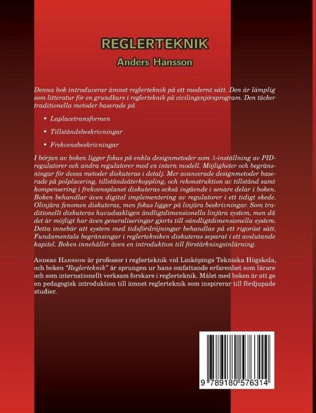 Denna bok introducerar ämnet reglerteknik på ett modernt sätt. Den är lämplig som litteratur för en grundkurs i reglerteknik på civilingenjörsprogram. Den täcker traditionella metoder baserade på - Laplacetransformen - Tillståndsbeskrivningar - Frekvensbeskrivningar I början av boken ligger fokus på enkla designmetoder som lambdainställning av PID-regulatorer och andra regulatorer med en intern modell. Möjligheter och begränsningar för dessa metoder diskuteras i detalj. Mer avancerade designmetoder baserade på polplacering, tillståndsåterkoppling, och rekonstruktion av tillstånd samt kompensering i frekvensplanet diskuteras också ingående i senare delar i boken. Boken behandlar även digital implementering av regulatorer i ett tidigt skede. Olinjära fenomen diskuteras, men fokus ligger på linjära beskrivningar. Som traditionellt diskuteras huvudsakligen ändligtdimensionella linjära system, men då det är möjligt har även generaliseringar gjorts till oändligtdimensionella system. Detta innebär att system med tidsfördröjningar behandlas på ett rigoröst sätt. Fundamentala begränsingar i reglertekniken diskuteras separat i ett avslutande kapitel. Boken innehåller även en introduktion till förstärkningsinlärning.