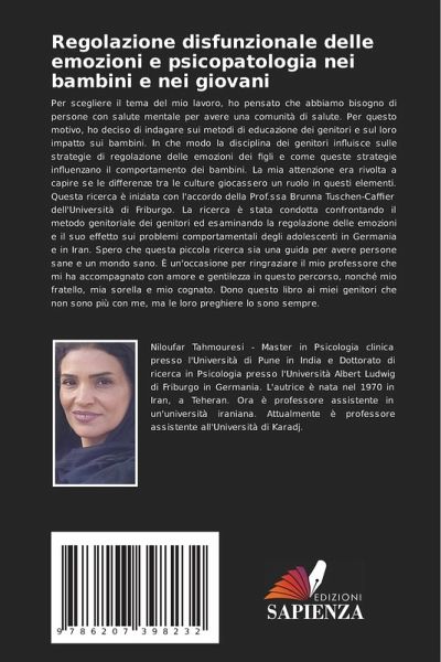 Per scegliere il tema del mio lavoro, ho pensato che abbiamo bisogno di persone con salute mentale per avere una comunità di salute. Per questo motivo, ho deciso di indagare sui metodi di educazione dei genitori e sul loro impatto sui bambini. In che modo la disciplina dei genitori influisce sulle strategie di regolazione delle emozioni dei figli e come queste strategie influenzano il comportamento dei bambini. La mia attenzione era rivolta a capire se le differenze tra le culture giocassero un ruolo in questi elementi. Questa ricerca è iniziata con l'accordo della Prof.ssa Brunna Tuschen-Caffier dell'Università di Friburgo. La ricerca è stata condotta confrontando il metodo genitoriale dei genitori ed esaminando la regolazione delle emozioni e il suo effetto sui problemi comportamentali degli adolescenti in Germania e in Iran. Spero che questa piccola ricerca sia una guida per avere persone sane e un mondo sano. È un'occasione per ringraziare il mio professore che mi ha accompagnato con amore e gentilezza in questo percorso, nonché mio fratello, mia sorella e mio cognato. Dono questo libro ai miei genitori che non sono più con me, ma le loro preghiere lo sono sempre.