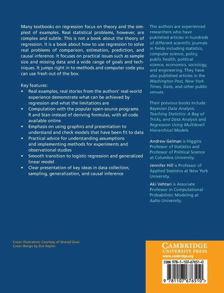 Most textbooks on regression focus on theory and the simplest of examples. Real statistical problems, however, are complex and subtle. This is not a book about the theory of regression. It is about using regression to solve real problems of comparison, estimation, prediction, and causal inference. Unlike other books, it focuses on practical issues such as sample size and missing data and a wide range of goals and techniques. It jumps right in to methods and computer code you can use immediately. Real examples, real stories from the authors' experience demonstrate what regression can do and its limitations, with practical advice for understanding assumptions and implementing methods for experiments and observational studies. They make a smooth transition to logistic regression and GLM. The emphasis is on computation in R and Stan rather than derivations, with code available online. Graphics and presentation aid understanding of the models and model fitting.