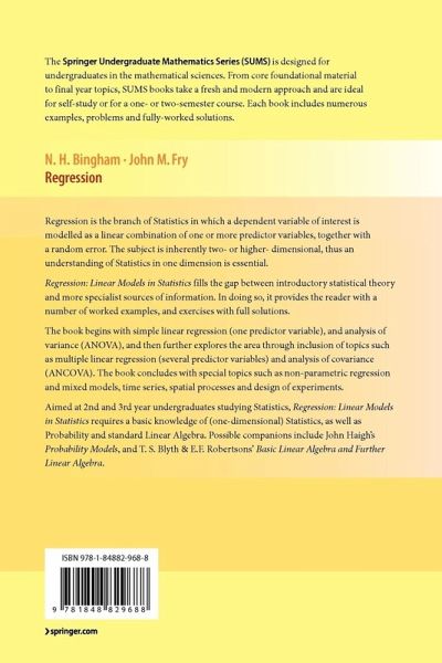 Aimed at 2nd and 3rd year undergraduates studying Statistics, Regression: Linear Models in Statistics requires a basic knowledge of (one-dimensional) Statistics, as well as Probability and standard Linear Algebra. Possible companions include John Haigh's Probability Models, and T. S. Blyth & E.F. Robertsons' Basic Linear Algebra and Further Linear Algebra.