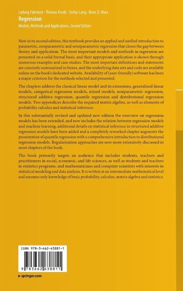 Now in its second edition, this textbook provides an applied and unified introduction to parametric, nonparametric and semiparametric regression that closes the gap between theory and application. The most important models and methods in regression are presented on a solid formal basis, and their appropriate application is shown through numerous examples and case studies. The most important definitions and statements are concisely summarized in boxes, and the underlying data sets and code are available online on the book's dedicated website. Availability of (user-friendly) software has been a major criterion for the methods selected and presented.