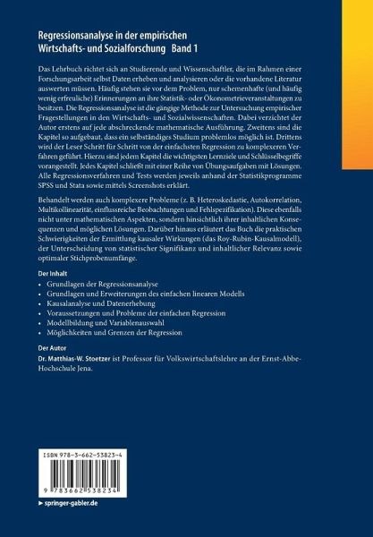 Das Lehrbuch richtet sich an Studierende und Wissenschaftler, die im Rahmen einer Forschungsarbeit selbst Daten erheben und analysieren oder die vorhandene Literatur auswerten müssen. Häufig stehen sie vor dem Problem, nur schemenhafte (und häufig wenig erfreuliche) Erinnerungen an ihre Statistik- oder Ökonometrieveranstaltungen zu besitzen. Die Regressionsanalyse ist die gängige Methode zur Untersuchung empirischer Fragestellungen in den Wirtschafts- und Sozialwissenschaften. Dabei verzichtet der Autor erstens auf jede abschreckende mathematische Ausführung. Zweitens sind die Kapitel so aufgebaut, dass ein selbständiges Studium problemlos möglich ist. Drittens wird der Leser Schritt für Schritt von der einfachsten Regression zu komplexeren Verfahren geführt. Hierzu sind jedem Kapitel die wichtigsten Lernziele und Schlüsselbegriffe vorangestellt. Jedes Kapitel schließt mit einer Reihe von Übungsaufgaben mit Lösungen. Alle Regressionsverfahren und Tests werden jeweils anhand der Statistikprogramme SPSS und Stata sowie mittels Screenshots erklärt.