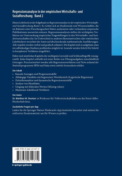 Dabei sind sämtlichen Kapiteln die wichtigsten Lernziele und Schlüsselbegriffe vorangestellt. Jedes Kapitel schließt mit einer Reihe von Übungsaufgaben einschließlich Lösungen. Praxisorientiert werden alle Regressionsverfahren und Tests anhand der Statistikprogramme SPSS und Stata sowie mittels Screenshots erklärt.