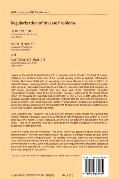 'It is written in a very clear style, the material is well organized, and there is an extensive bibliography with 290 items. There is no doubt that this book belongs to the modern standard references on ill-posed and inverse problems. It can be recommended not only to mathematicians interested in this, but to students with a basic knowledge of functional analysis, and to scientists and engineers working in this field.' -- Mathematical Reviews Clippings, 97k