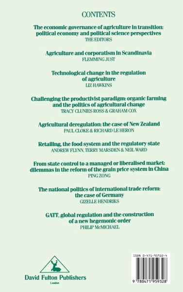 Changing Regulatory Orders: The Analysis of the Economic Governanceof Agriculture (P. Lowe, et al.). Agriculture and Corporatism in Scandinavia (F. Just). Challenging the Productivist Paradigm: Organic Farming and thePolitics of Agricultural Change (T. Clunies-Ross & G.Cox). Technological Change in the Regulation of Agriculture (E.Hawkins). Retailing, the Food System and the Regulatory State (A. Flynn, etal.). Agricultural Deregulation: The Case of New Zealand (P. Cloke &R. Le Heron). From State Control to a Managed or Liberalised Market: Dilemmas inthe Reform of the Grain Price System in China (P. Zong). The National Politics of International Trade Reform: The Case ofGermany (G. Hendriks). GATT, Global Regulation and the Construction of a New HegemonicOrder (P. McMichael).