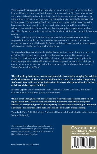 This book addresses gaps in thinking and practice on how the private sector can both help and hinder the process of building peace after armed conflict. It argues that weak governance in fragile and conflict-affected societies creates a need for international authorities to regulate the social impact of business activity in these places as a special interim duty. Policymaking should seek appropriate opportunities to engage with business while harnessing its positive contributions to sustainable peace. However, scholars have not offered frameworks for what is considered 'appropriate' engagement or properly theorised techniques for how best to influence responsible business conduct. United Nations peace operations are peak symbols of international regulatory responsibilities in conflict settings, and debate continues to grow around the private sector's role in development generally. This book is the first to study how peace operations have engaged with business to influence its peace-building impact.