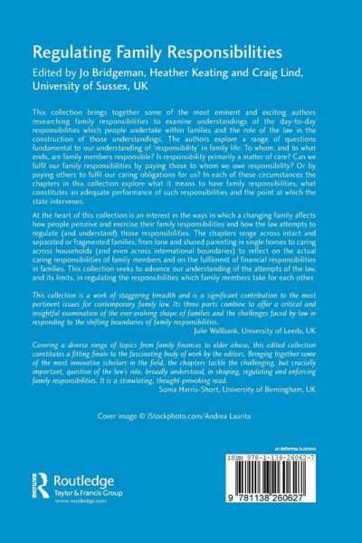 Chapter 1: Supporting, Fostering and Coercing? The Legal Regulation of the Exercise of Family Responsibilities; Part I: The Gendered Nature of Family Responsibility; Chapter 2: Parent's Work-Life Balance: Beyond Responsibilities and Obligations to Agency and Capabilities; Chapter 3: The Responsible Father in New Labour's Legal and Social Policy; Chapter 4: The Court of Motherhood: Affect, Alienation and Redefinitions of Responsible Parenting; Chapter 5: Responsibility in Family Finance and Property Law; Part II: Regulating Responsibilities in Fragmented Families; Chapter 6: Negotiating Shared Residence: The Experience of Separated Fathers in Britain and France; Chapter 7: Law's Gendered Understandings of Parents' Responsibilities in Relation to Shared Residence; Chapter 8: Regulating Responsibilities in Relocation Disputes; Chapter 9: Child Abduction in the European Union: Recognizing and Regulating Care and Migration; Part III: Acknowledging Caring Responsibilities?; Chapter 10: Grandparent Involvement and Adolescent Adjustment: Should Grandparents have Legal Rights?; Chapter 11: Reflections on the Duty to Care for the Elderly in Portugal; Chapter 12: Elder Abuse and Stressing Carers; Chapter 13: Intensive Caring Responsibilities and Crimes of Compassion? 1; Chapter 14: Sufficiency of Home Care for Extraordinary Children: Gender and Health Law in Canada; Chapter 15: Why We Should Care About Global Caring 1