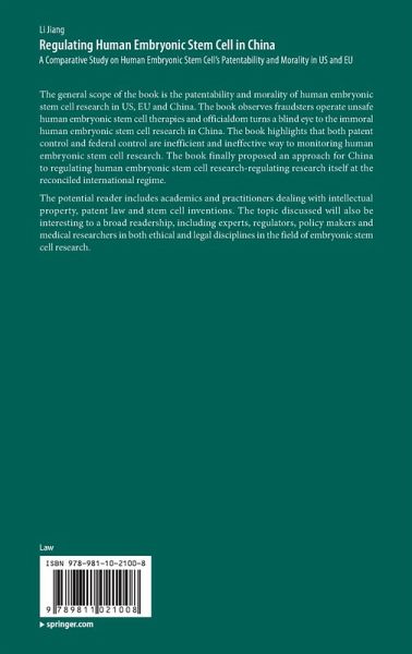 The general scope of the book is the patentability and morality of human embryonic stem cell research in US, EU and China. The book observes fraudsters operate unsafe human embryonic stem cell therapies and officialdom turns a blind eye to the immoral human embryonic stem cell research in China. The book highlights that both patent control and federal funding control are inefficient and ineffective way to monitoring human embryonic stem cell research. The book finally proposed an approach for china to regulating human embryonic stem cell research-regulating research itself at the reconciled international regime.