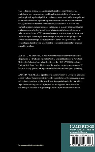 This collection of essays looks at the role the European Union could and should play in promoting healthier lifestyle, in light of the moral, philosophical, legal and political challenges associated with the regulation of individual choices. By tackling the main non-communicable diseases (NCD) risk factors (tobacco consumption, harmful use of alcohol, unhealthy diets and lack of physical activity), the contributors endeavour to identify common themes and determine whether and, if so, to what extent the lessons learned in relation to each area of EU intervention could be transposed to the others. By focusing on the European Union legal order, the book highlights both the opportunities that legal instruments offer for NCD prevention and control agenda in Europe, as well as the constraints that the law imposes on policy-makers.