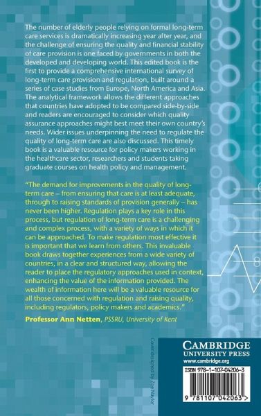 The number of elderly people relying on formal long-term care services is dramatically increasing year after year, and the challenge of ensuring the quality and financial stability of care provision is one faced by governments in both the developed and developing world. This edited book is the first to provide a comprehensive international survey of long-term care provision and regulation, built around a series of case studies from Europe, North America and Asia. The analytical framework allows the different approaches that countries have adopted to be compared side by side and readers are encouraged to consider which quality assurance approaches might best meet their own country's needs. Wider issues underpinning the need to regulate the quality of long-term care are also discussed. This timely book is a valuable resource for policymakers working in the health care sector, researchers and students taking graduate courses on health policy and management.