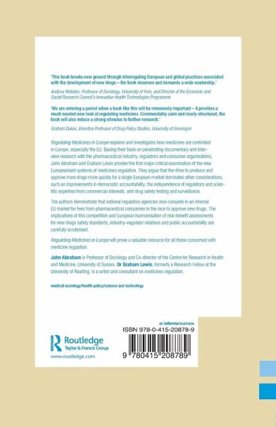 This Book explains and investigates how medicines are controlled in Europe, especially the EU. Based on penetrating documentary and interview research with the pharmaceutical industry, regulators and consumer organisations,it provides the first major critical examination of the new Europeanised systems of medicine regulation. The authors argue that the drive to produce and approve more drugs more quickly for a single European market dominates other considerations, such as improvements in democratic accountability, the independence of regulators and scientific expertise from commercial interests, and drug safety testing and surveillance.