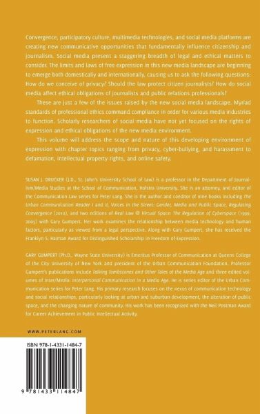 Convergence, participatory culture, multimedia technologies, and social media platforms are creating new communicative opportunities that fundamentally influence citizenship and journalism. Social media present a staggering breadth of legal and ethical matters to consider. The limits and laws of free expression in this new media landscape are beginning to emerge both domestically and internationally, causing us to ask the following questions: How do we conceive of privacy? Should the law protect citizen journalists? How do social media affect ethical obligations of journalists and public relations professionals? These are just a few of the issues raised by the new social media landscape. Myriad standards of professional ethics command compliance in order for various media industries to function. Scholarly researchers of social media have not yet focused on the rights of expression and ethical obligations of the new media environment. This volume will address the scope and nature of this developing environment of expression with chapter topics ranging from privacy, cyber-bullying, and harassment to defamation, intellectual property rights, and online safety.