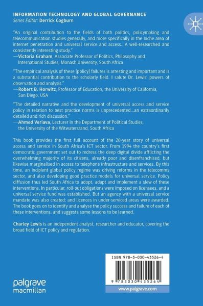 This book provides the first full account of the 20-year story of universal access and service in South Africa's ICT sector. From 1994 the country's first democratic government set out to redress the deep digital divide afflicting the overwhelming majority of its citizens, already poor and disenfranchised, but likewise marginalised in access to telephone infrastructure and services. By this time, an incipient global policy regime was driving reforms in the telecomms sector, and also developing good practice models for universal service. Policy diffusion thus led South Africa to adopt, adapt and implement a slew of these interventions. In particular, roll-out obligations were imposed on licensees, and a universal service fund was established. But an agency with a universal service mandate was also created; and licences in under-serviced areas were awarded. The book goes on to identify and analyse the policy success and failure of each of these interventions, and suggests some lessonsto be learned.