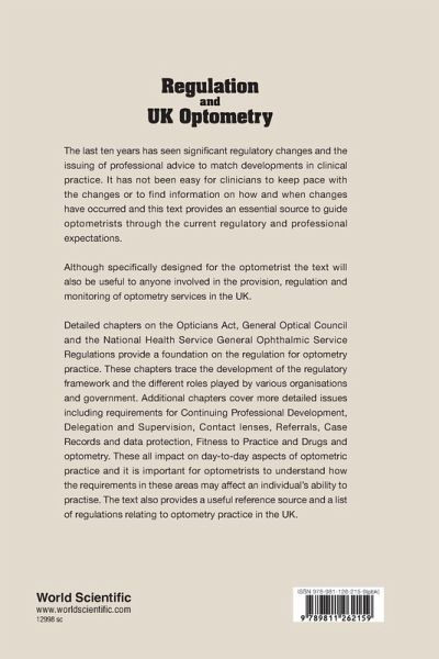 he last ten years has seen significant regulatory changes and the issuing of professional advice to match developments in clinical practice. It has not been easy for clinicians to keep pace with the changes or to find information on how and when changes have occurred and this text provides an essential source to guide optometrists through the current regulatory and professional expectations. Although specifically designed for the optometrist the text will also be useful to anyone involved in the provision, regulation and monitoring of optometry services in the UK. Detailed chapters on the Opticians Act, General Optical Council and the National Health Service General Ophthalmic Service Regulations provide a foundation on the regulation for optometry practice. These chapters trace the development of the regulatory framework and the different roles played by various organisations and government. Additional chapters cover more detailed issues including requirements for Continuing Professional Development, Delegation and Supervision, Contact lenses, Referrals, Case Records and data protection, Fitness to Practice and Drugs and optometry. These all impact on day-to-day aspects of optometric practice and it is important for optometrists to understand how the requirements in these areas may affect an individual's ability to practise. The text also provides a useful reference source and a list of regulations relating to optometry practice in the UK.