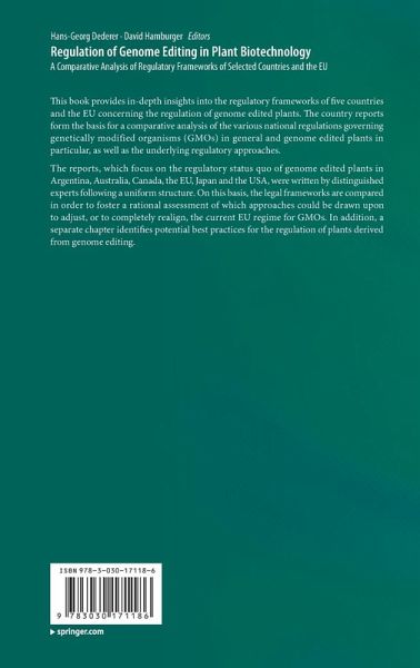 FM.- Introduction: Regulation of plants derived from genome editing - What Lessons to be learned from other countries?.- Regulation of Genome Editing in Plant Biotechnology: Argentina.- Regulation of Genome Editing in Plant Biotechnology: Australia.- Regulation of Genome Editing in Plant Biotechnology: Canada.- Regulation of Genome Editing in Plant Biotechnology: European Union.- Regulation of Genome Editing in Plant Biotechnology: Japan.- Genetic Engineering in the United States: Regulation of crops and their food products.- Comparative Analysis: The Regulation of Plants Derived from Genome Editing in Argentina, Australia, Canada, the European Union, Japan and the United States.- Appendix.