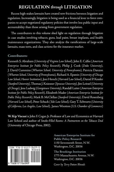 "A Brookings Institution Press and American Enterprise Institute publication Recent high-profile lawsuits involving cigarettes, guns, breast implants, and other products have created new frictions between litigation and regulation. Increasingly, litigation is being used as a financial lever to force companies to accept negotiated regulatory policiespolicies that invariably involve less public input and accountability than those arising from government regulation. The process not only usurps the traditional governmental authority for regulation, but also shifts the locus of establishing tax policy from the legislature to the parties involved in the litigation. Citizen interests are not explicitly represented and there is no mechanism to ensure that these outcomes are in society's best interests. By focusing on case studies involving the tobacco industry, guns, lead paint, breast implants, and health maintenance organizations, the contributors to this volume collectively shed light on the likely consequences of regulation through litigation for insurance markets and society at large. They analyze the ramifications of large-scale lawsuits, mass torts, and class actions for the insurance market, and advocate increased public scrutiny of attorney reimbursement and a competitive bidding process for all lawsuits involving government entities as the plaintiffs. "