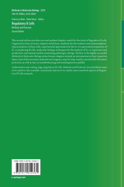 Purification and characterization of murine MZ and T2-MZP cells.- Purification and immune-phenotyping of B-1 cells from body cavities of mice.- Purification and immunophenotypic characterization of murine plasma cells.- Purification of murine and human IL-10 producing B cells from different anatomical compartments.- Purification and immunophenotypic characterization of human CD19+CD24hiCD38hi and CD19+CD24hiCD27+ B cells.- Detection of IL-10 in murine B cells: in vitro and in vivo techniques.- Detection and quantification of transforming growth factor-beta1 produced by murine B cells: pros and cons of different techniques.- IL-35 detection in B cells at the mRNA and protein level.- Characterization and activation of Fas Ligand producing mouse B cells and their killer exosomes.- Characterization and activity of TIM-1 and IL-10-reporter expressing regulatory B cells.- New method for the expansion of highly purified human regulatory granzyme B-expressing B cells.- Characterization of the cell surface phenotype and regulatory activity of B cell IgD low (BDL) regulatory B cells.- Use of Toll-like receptor (TLR) ligation to characterize human regulatory B cells subsets.- Use of co-cultures for the study of cellular interactions influencing B cell regulatory functions.- Use of inhibitory compounds to dissect the molecular pathways involved in regulatory B cell differentiation.- Methods to study the transcriptome of regulatory B cells.- Purification of murine IL-10+ B cells for analyses of biological functions and transcriptomics.- il-10 gene locus DNA methylation in regulatory B cells.- B cell commitment to IL-10 production: the Vert-X Il10egfp mouse.- Regulatory B cells in experimental mouse models of arthritis.- Regulatory and IgE+ B cells in allergic asthma.- Regulatory B cells in type 1 diabetes.- Analysis of regulatory B cells in experimental autoimmune uveitis.- Purification and immunophenotypic characterization of human CD24hiCD38hi and CD24hiCD27+ regulatory B cells in transplantation.