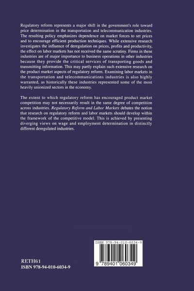 The extent to which regulatory reform has encouraged product market competition may not necessarily result in the same degree of competition across industries. Regulatory Reform and Labor Markets debates the notion that research on regulatory reform and labor markets should develop within the framework of the competitive model. This is achieved by presenting diverging views on wage and employment determination in distinctly different deregulated industries.