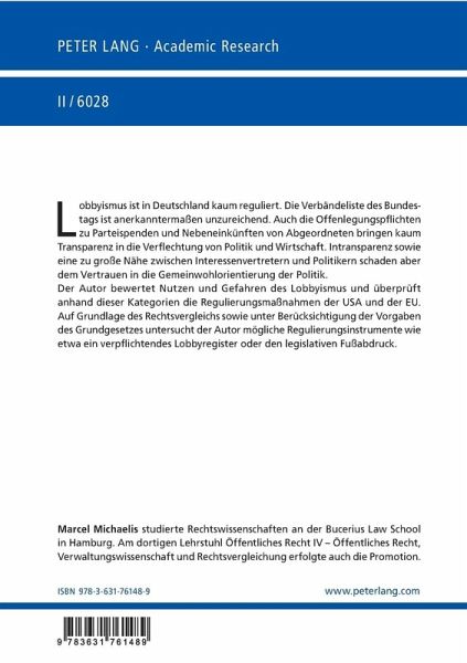 Der Autor bewertet Nutzen und Gefahren des Lobbyismus und überprüft anhand dieser Kategorien die Regulierungsmaßnahmen der USA und der EU. Auf Grundlage des Rechtsvergleichs sowie unter Berücksichtigung der Vorgaben des Grundgesetzes untersucht der Autor mögliche Regulierungsinstrumente wie etwa ein verpflichtendes Lobbyregister oder den legislativen Fußabdruck.