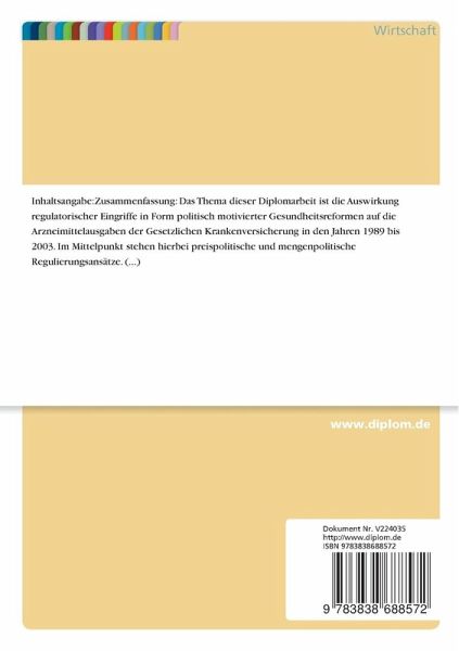 Das Thema dieser Diplomarbeit ist die Auswirkung regulatorischer Eingriffe in Form politisch motivierter Gesundheitsreformen auf die Arzneimittelausgaben der Gesetzlichen Krankenversicherung in den Jahren 1989 bis 2003.