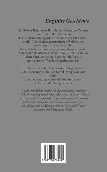 Der Römer Regulus ist Bursche im Dienst des Zenturio Primus Pilus Marcus Caelius. Das Mädchen Rindgard, vom Stamm der Cherusker, ist die Tochter eines germanischen Waldbauers.Sie wissen nichts voneinander. Sie sind sich noch nie begegnet und dennoch ist ihr Schicksal miteinander verknüpft, im Jahr 9 n. Chr., in dem Varus mit seinen Legionen tief in die germanischen Wälder eingedrungen ist. Ein Sieger, der über Nacht zum Besiegten wird. Eine Bezwungene, die sich fremd im eigenen Land fühlt. Eine Begegnung in einer der fürchterlichsten Schlachten der Weltgeschichte. Regulus und Rinda - Teil 1, erzählt von der cheruskisch-römischen Schicksalsbegegnung zweier junger Menschen, die in den Wirren der Varusschlacht aufeinandertreffen und durch die entstehenden Konflikte aneinanderwachsen und reifen. Im Mittelpunkt des Romans steht die Liebe, die Gräben überwindet und Versöhnung schafft.
