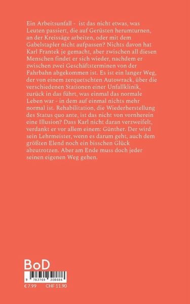 Ein Arbeitsunfall - ist das nicht etwas, was Leuten passiert, die auf Gerüsten herumturnen, an der Kreissäge arbeiten, oder mit dem Gabelstapler nicht aufpassen? Nichts davon hat Karl Frantek je gemacht, aber zwischen all diesen Menschen findet er sich wieder, nachdem er zwischen zwei Geschäftsterminen von der Fahrbahn abgekommen ist. Es ist ein langer Weg, der von einem zerquetschten Autowrack, über die verschiedenen Stationen einer Unfallklinik, zurück in das führt, was einmal das normale Leben war - in dem auf einmal nichts mehr normal ist. Rehabilitation, die Wiederherstellung des Status quo ante, ist das nicht von vornherein eine Illusion? Dass Karl nicht daran verzweifelt, verdankt er vor allem einem: Günther. Der wird sein Lehrmeister, wenn es darum geht, auch dem größten Elend noch ein bisschen Glück abzutrotzen. Aber am Ende muss doch jeder seinen eigenen Weg gehen.