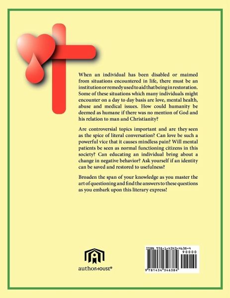 When an individual has been disabled or maimed from situations encountered in life, there must be an institution or remedy used to aid that being in restoration. Some of these situations which many individuals might encounter on a day to day basis are love, mental health, abuse and medical issues. How could humanity be deemed as humane if there was no mention of God and his relation to man and Christianity? Are controversial topics important and are they seen as the spice of literal conversation? Can love be such a powerful vice that it causes mindless pain? Will mental patients be seen as normal functioning citizens in this society? Can educating an individual bring about a change in negative behavior? Ask yourself if an identity can be saved and restored to usefulness? Broaden the span of your knowledge as you master the art of questioning and find the answers to these questions as you embark upon this literary express!