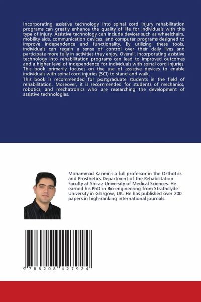 Incorporating assistive technology into spinal cord injury rehabilitation programs can greatly enhance the quality of life for individuals with this type of injury. Assistive technology can include devices such as wheelchairs, mobility aids, communication devices, and computer programs designed to improve independence and functionality. By utilizing these tools, individuals can regain a sense of control over their daily lives and participate more fully in activities they enjoy. Overall, incorporating assistive technology into rehabilitation programs can lead to improved outcomes and a higher level of independence for individuals with spinal cord injuries. This book primarily focuses on the use of assistive devices to enable individuals with spinal cord injuries (SCI) to stand and walk.This book is recommended for postgraduate students in the field of rehabilitation. Moreover, it is recommended for students of mechanics, robotics, and mechatronics who are researching the development of assistive technologies.