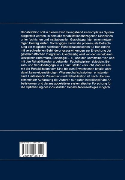 Rehabilitation und Medizin.- 1. Einleitung.- 2. Begriffe.- 3. Synopsis.- 4. Rehabilitationseinrichtungen.- 5. Der Rehabilitationsprozeß.- 6. Übergeordnete Ziele und Aufgaben.- 7. Schluß.- Literatur.- Rehabilitation und Psychologie.- 1. Fragestellung.- 2. Psychologische Aspekte der Rehabilitation.- 3. Psychodiagnostik in der Rehabilitation.- 4. Psychotherapie.- 5. Zukunft der Rehabilitationspsychologie.- Literatur.- Rehabilitation und Soziologie.- 1. Ausbildung in und Lehrfunktionen der Soziologie.- 2. Systematisiertes Wissen?.- 3. Zur Praxisrolle.- 4. Soziologische Forschungsfragen.- Literatur.- Rehabilitation und Pädagogik.- 1. Problemstellung.- 2. Pädagogik, Schule und Rehabilitationsprozeß.- 3. Pädagogik und berufliche Rehabilitation.- 4. Pädagogik und Forschung in der Rehabilitation.- Literatur.- Rehabilitation und Technik.- 1. Einleitung.- 2. Systematik technischer Probleme in der Rehabilitation.- 3. Schlußbetrachtung.- Rehabilitation und Informatik.- 1. Gesellschaftspolitische Überlegungen.- 2. Instrumente der Informatik.- 3. Anwendungsbeispiele der Informatik in der Rehabilitation.- 4. Schlußbemerkungen.- Literatur.