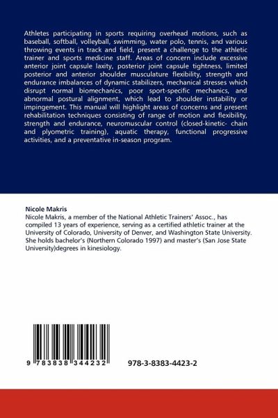 Athletes participating in sports requiring overhead motions, such as baseball, softball, volleyball, swimming, water polo, tennis, and various throwing events in track and field, present a challenge to the athletic trainer and sports medicine staff. Areas of concern include excessive anterior joint capsule laxity, posterior joint capsule tightness, limited posterior and anterior shoulder musculature flexibility, strength and endurance imbalances of dynamic stabilizers, mechanical stresses which disrupt normal biomechanics, poor sport-specific mechanics, and abnormal postural alignment, which lead to shoulder instability or impingement. This manual will highlight areas of concerns and present rehabilitation techniques consisting of range of motion and flexibility, strength and endurance, neuromuscular control (closed-kinetic- chain and plyometric training), aquatic therapy, functional progressive activities, and a preventative in-season program.