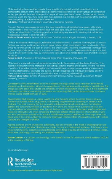 Rehabilitation Work provides a unique insight into what happens behind the closed doors of prisons, probation and parole offices, drug rehabs, and recovery support services drawing on research from Australia. Applied examples of how practitioners collaborate, lead and innovate in the midst of challenging work are complemented with evocative illustrations of insider humour and professional resilience. This book is a key resource for students, academics and practitioners across fields including criminology and criminal justice, social work, psychology, counselling and addiction treatment.
