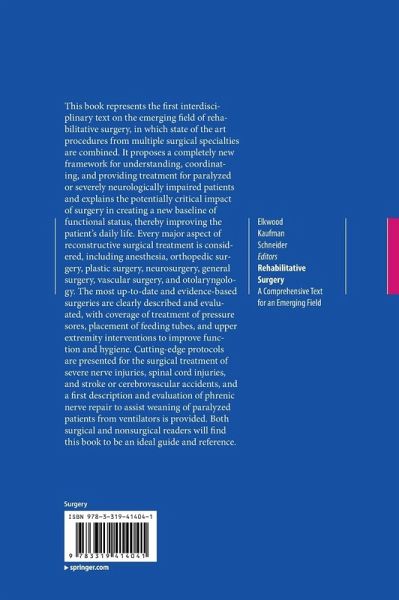 This book represents the first interdisciplinary text on the emerging field of rehabilitative surgery, in which state of the art procedures from multiple surgical specialties are combined. It proposes a completely new framework for understanding, coordinating, and providing treatment for paralyzed or severely neurologically impaired patients and explains the potentially critical impact of surgery in creating a new baseline of functional status, thereby improving the patient's daily life. Every major aspect of reconstructive surgical treatment is considered, including anesthesia, orthopedic surgery, plastic surgery, neurosurgery, general surgery, vascular surgery, and otolaryngology. The most up-to-date and evidence-based surgeries are clearly described and evaluated, with coverage of treatment of pressure sores, placement of feeding tubes, and upper extremity interventions to improve function and hygiene. Cutting-edge protocols are presented for the surgical treatment of severe nerve injuries, spinal cord injuries, and stroke or cerebrovascular accidents, and a first description and evaluation of phrenic nerve repair to assist weaning of paralyzed patients from ventilators is provided. Both surgical and nonsurgical readers will find this book to be an ideal guide and reference.