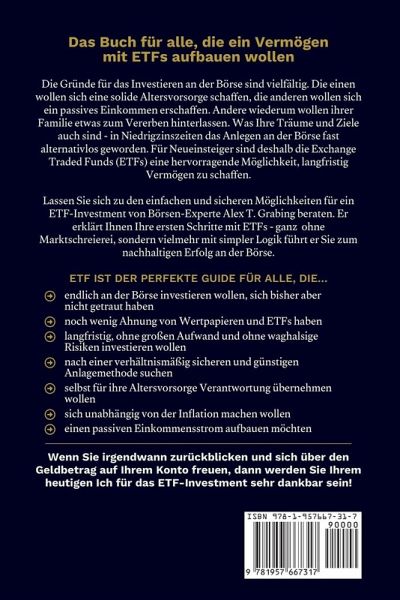 Möchten Sie Ihre Elektro- und Elektronikgeräte kostenlos recyceln? Mehr erfahren Das Buch speziell für alle Börsen-Einsteiger, die ein Vermögen mit ETFs aufbauen wollen, aber noch nicht genau wissen, wie sie starten sollen. Für Neueinsteiger sind die Exchange Traded Funds (ETFs) eine hervorragende Möglichkeit, langfristig Vermögen aufzubauen. Denn seien wir mal ehrlich:Die Zinsen auf Ihrem Bankkonto sind so gering, dass Sie ihr Geld keinesfalls auf Ihrem Konto lassen sollten. Sie verbrennen jeden Tag Geld, solange Sie Ihr Vermögen auf dem Sparbuch parken (Da sind sich alle Experten einig). Immobilien werden zum Vermögensaufbau angepriesen. Aber diese Investitionen sind bei den aktuell hohen Preisen nur für Menschen mit ausreichend Risiko-Kapital und Vorwissen geeignet. In einzelne Aktien zu investieren als Börsen-Einsteiger hochriskant. Hier treten Sie gegen Aktien-Profis an. Eine Tesla-Aktie zu besitzen, ist zwar ein gutes Gesprächsthema für eine Party, aber nicht unbedingt eine gute Investition. Aber eins vorweg: Mit ETFs ist es nicht möglich, den Markt zu schlagen (97% der Aktien-Profis schaffen das übrigens auch nicht). Aber das ist auch nicht das Ziel, denn: Mit ETFs investieren Sie bequem in einen Index, wie dem DAX oder Dow Jones und folgen seiner Rendite. Mit einem Durchschnitt von ca. 8 % pro Jahr lässt sich schon mit dem DAX langfristig ein ordentliches Vermögen aufbauen. Wie diese einfache, aber geniale Investment-Methode im Detail funktioniert, erfahren Sie in diesem Praxis-Ratgeber vom Börsenexperten Alex T. Grabing. Reich mit ETFs ist der perfekte Guide für alle, die...endlich an der Börse investieren wollen, sich bisher aber nicht getraut haben noch wenig Ahnung von Wertpapieren und ETFs haben langfristig, ohne großen Aufwand und ohne waghalsige Risiken investieren wollen nach einer verhältnismäßig sicheren und günstigen Anlagemethode suchen selbst für ihre Altersvorsorge Verantwortung übernehmen wollen sich unabhängig von der Inflation machen wollen einen passiven Einkommensstrom aufbauen möchten Das Buch zeigt Ihnen, wie Sie als Einsteiger Schritt für Schritt in ETFs investieren und langfristig ihr Vermögen mehren. Mit ETFs wählen Sie dabei einen der einfachsten und kosteneffizientesten Wege. Lernen Sie dabei,Ihr Risiko zu streuen intelligente Anlagestrategien anzuwenden bei Schwankungen nicht in Panik zu verfallen mit ETFs Geld zu verdienen. Damit schon bald Ihre Träume wahr werden!