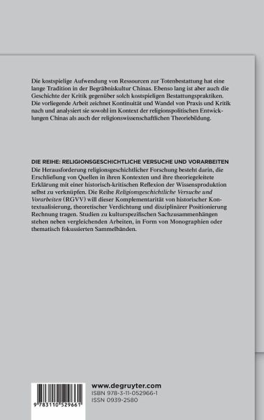 Die kostspielige Aufwendung von Ressourcen zur Totenbestattung hat eine lange Tradition in der Begräbniskultur Chinas. Ebenso lang ist aber auch die Tradition der Kritik gegenüber solch kostspieligen Bestattungspraktiken. Die vorliegende Arbeit zeichnet Kontinuität und Wandel von Praxis und Kritik nach und analysiert sie sowohl im Kontext der religionspolitischen Entwicklungen Chinas als auch der religionswissenschaftlichen Theoriebildung.