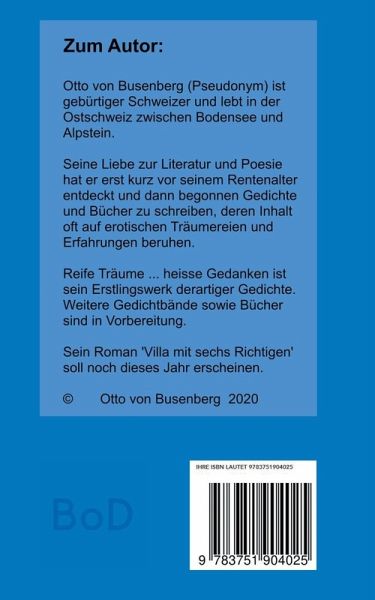 Bei diesem Gedichtband handelt es sich um erotische Geschichten in Gedichtform deshalb die etwas seltsam anmutende Bezeichnung:Erotische 'Gedichten' eines SeniorenErotische und sexuelle Zonen und Praktiken werden hier offen beim Namen genannt.Wer damit nicht klar kommt, sollte tunlichst darauf verzichten weiter zu lesen. Da der Inhalt teilweise auch Fetisch orientiert ist, geht es doch manchmal auch um Gummi- und Latex-Spielereien, die auch Fesselspiele nicht ausschliessen, sollte man schon ein Fable für diese Thematik haben. Dann allerdings wird man beim Lesen vor seinem geistigen Auge die erregenden Momente miterleben können.Andere Gedichte sind von tiefgreifender Zärtlichkeit und Zuneigung geprägt oder haben zuweilen auch einen etwas philosophischen Hintergrund.