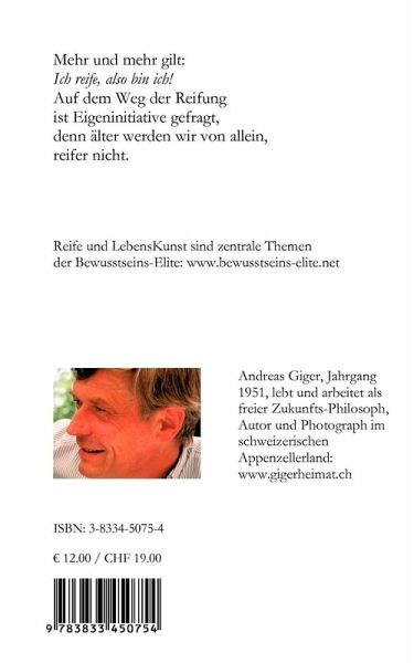 Mehr und mehr gilt: Ich reife, also bin ich! Auf dem Weg der Reifung ist Eigeninitiative gefragt, denn älter werden wir von allein, reifer nicht. In zwölf kurzen Essays mit jeweils einem Schmuckbild wird eine neue Sicht des älter Werdens entwickelt: Reife macht Sinn! Reife und LebensKunst sind zentrale Themen der Bewusstseins-Elite: www.bewusstseins-elite.net Andreas Giger, Jahrgang 1951, lebt und arbeitet als freier Zukunfts-Philosoph, Autor und Photograph im schweizerischen Appenzellerland: www.gigerheimat.ch