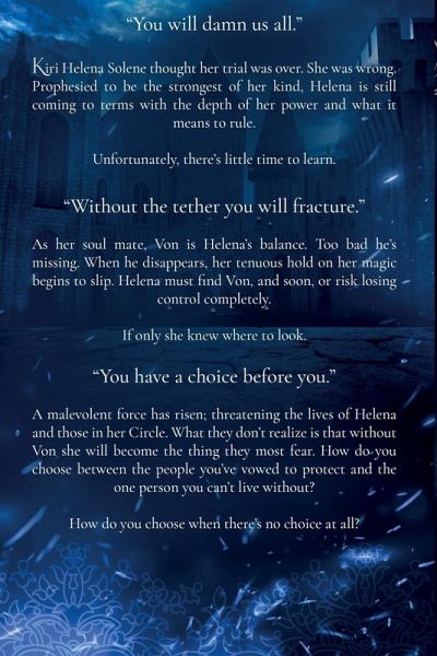 "You will damn us all." Kiri Helena Solene thought her trial was over. She was wrong. Prophesied to be the strongest of her kind, Helena is still coming to terms with the depth of her power and what it means to rule. Unfortunately, there's little time to learn. "Without the tether you will fracture." As her soul mate, Von is Helena's balance. Too bad he's missing. When he disappears, her tenuous hold on her magic begins to slip. Helena must find Von, and soon, or risk losing control completely. If only she knew where to look. "You have a choice before you." A malevolent force has risen; threatening the lives of Helena and those in her Circle. What they don't realize is that without Von she will become the thing they most fear. How do you choose between the people you've vowed to protect and the one person you can't live without? How do you choose when there's no choice at all?