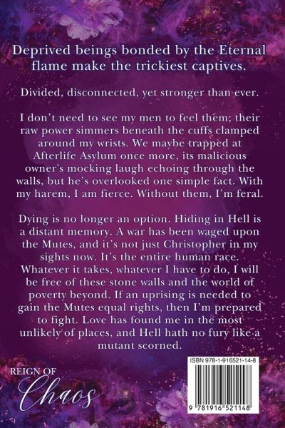 Deprived beings bonded by the Eternal flame make the trickiest captives. Divided, disconnected, yet stronger than ever. I don't need to see my men to feel them; their raw power simmers beneath the cuffs clamped around my wrists. We maybe trapped at Afterlife Asylum once more, its malicious owner's mocking laugh echoing through the walls, but he's overlooked one simple fact. With my harem, I am fierce. Without them, I'm feral. Dying is no longer an option. Hiding in Hell is a distant memory. A war has been waged upon the Mutes, and it's not just Christopher in my sights now. It's the entire human race. Whatever it takes, whatever I have to do, I will be free of these stone walls and the world of poverty beyond. If an uprising is needed to gain the Mutes equal rights, then I'm prepared to fight. Love has found me in the most unlikely of places, and Hell hath no fury like a mutant scorned. Trigger warning: This novel is the first in a dark RH trilogy. Certain themes such as sex, self-harm, death and controversial beliefs are featured so anyone easily offended should avoid. However, those who always fall for the twisted, deranged villain and never question their own sanity about it, the Afterlife Asylum is the place for you.