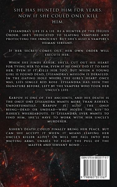 She has hunted him for years. Now if she could only kill him. Lyssandra's life is a lie. As a hunter of the Helius Order, she's dedicated to slaying vampires and protecting the innocent. But she's also a vampire's human servant. If her secret comes out, her own order will execute her. When she finds Asher, she'll cut out his heart for tying her to him, even if he only did it to save her. Even if it kills her too. But when a young girl is found dead, Lyssandra's mission is derailed. In the gaping hole where the girl's heart once was, lies single red rose. Lyssandra has seen the signature before, left by the vampire who took her uncle's life. Karpov is one of the ancients, and his death is the only one Lyssandra wants more than Asher's. Unfortunately, Karpov is also the only being-dead or undead-who holds the key to Asher's whereabouts. If Lyssandra ever wants to find him, she'll have to work with her uncle's murderer. Asher's death could finally bring her peace, but can she accept it when it means leaving her uncle's killer alive? Or will she fall into his waiting arms, unable to fight the pull of the master and servant bond . . .