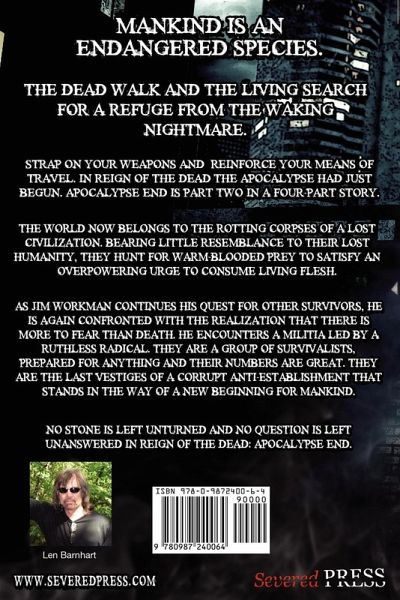 Mankind is an endangered species. The dead walk and the living search for a refuge from the waking nightmare. Strap on your weapons and reinforce your means of travel. In Reign of the Dead the apocalypse had just begun. Apocalypse End is part two in a four-part story. The world now belongs to the rotting corpses of a lost civilization. Bearing little resemblance to their lost humanity, they hunt for warm-blooded prey to satisfy an overpowering urge to consume living flesh. As Jim workman continues his quest for other survivors, he is again confronted with the realization that there is more to fear than death. He encounters a Militia led by a ruthless radical. They are a group of survivalists, prepared for anything and their numbers are great. They are the last vestiges of a corrupt anti-establishment that stands in the way of a new beginning for mankind. No stone is left unturned and no question is left unanswered in Reign of the Dead: Apocalypse End.