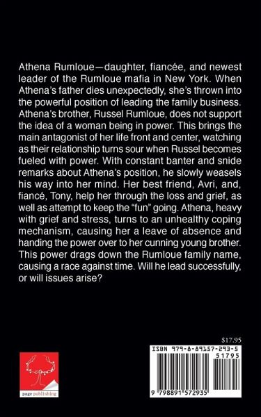 Athena Rumloue--daughter, fiancee, and newest leader of the Rumloue mafia in New York. When Athena's father dies unexpectedly, she's thrown into the powerful position of leading the family business. Athena's brother, Russel Rumloue, does not support the idea of a woman being in power. This brings the main antagonist of her life front and center, watching as their relationship turns sour when Russel becomes fueled with power. With constant banter and snide remarks about Athena's position, he slowly weasels his way into her mind. Her best friend, Avri, and, fiance, Tony, help her through the…mehr