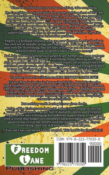 When the world wants you to have nothing, take everything. Dr. Everything is a supervillain who wants nothing short of that. He has the brains and the power to take it, but there is one annoying superhero standing in his way: The Courageous Cricket-Man. The irritating insect has been a thorn in Dr. Everything's side for years, but the villain is not alone in his annoyance. He knows he can't take the world on his own, so he'll have to rely on a few fellow supervillains to aid him in his endeavor to rid Pristine City of its cricket infestation problem. Osprey's a brilliant inventor who can soar through the sky thanks to his own set of metallic wings and flight pack. He's had a contentious past with Dr. Everything, but are they willing to put all that happened between them aside to destroy their common enemy? Bad Juju and the Glamourous Gargoyle are former tag team partners turned supervillains, and Dr. Everything needs them as well. Bad Juju is a master illusionist who can turn reality on its head with a few muttered magic words, and Glam Gargoyle can wield enough Hellfire to turn her victims to ashes. Rounding out the team is Kilowatt, a surly miscreant and bank robber with electricity in his veins. Despite their differences, these five villains are destined to become THE UNFORTUNATE FIVE! Cricket-Man isn't going to know what hit him, but defeating the black-suited bug may be the least of the Unfortunate Five's problems. They'll still have to deal with breaking out of prison, infighting among Pristine City's other baddies, learning to work as a cohesive group, and all the other unknown variables that pop up in Dr. Everything's exhaustive calculations. But nothing worth having is ever given freely.