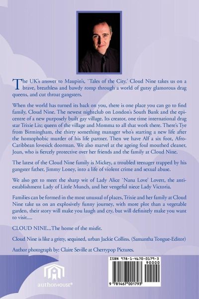 The UK's answer to Maupin's, `Tales of the City.' Cloud Nine takes us on a brave, breathless and bawdy romp through a world of gutsy glamorous drag queens, and cut throat gangsters. When the world has turned its back on you, there is one place you can go to find family, Cloud Nine. The newest nightclub on London's South Bank and the epi-centre of a new purposely built gay village. Its creator, one time international drag star Trixie Lix; queen of the village and Momma to all that work there. There's Tye from Birmingham, the thirty something manager who's starting a new life after the homophobic murder of his life partner. Then we have Alf a six foot, Afro-Caribbean lovesick doorman. We also marvel at the ageing foul mouthed cleaner, Joan, who is fiercely protective over her friends and the family at Cloud Nine. The latest of the Cloud Nine family is Mickey, a troubled teenager trapped by his gangster father, Jimmy Loney, into a life of violent crime and sexual abuse. We also get to meet the sharp wit of Lady Alice `Nana Love' Lovett, the anti-establishment Lady of Little Munch, and her vengeful niece Lady Victoria. Families can be formed in the most unusual of places, Trixie and her family at Cloud Nine take us on an explosively funny journey, with more plot than a vegetable garden, their story will make you laugh and cry, but will definitely make you want to visit.... CLOUD NINE...The home of the misfit. Cloud Nine is like a gritty, sequined, urban Jackie Collins. (Samantha Tongue-Editor)