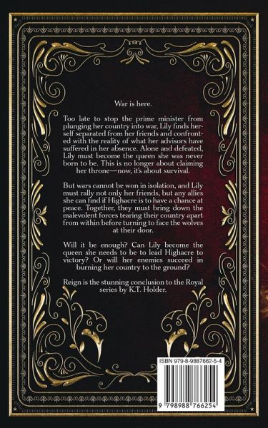 War is here. Too late to stop the prime minister from plunging her country into war, Lily finds herself separated from her friends and confronted with the reality of what her advisors have suffered in her absence. Alone and defeated, Lily must become the queen she was never born to be. This is no longer about claiming her throne-now, it's about survival. But wars cannot be won in isolation, and Lily must rally not only her friends, but any allies she can find if Highacre is to have a chance at peace. Together, they must bring down the malevolent forces tearing their country apart from within before turning to face the wolves at their door. Will it be enough? Can Lily become the queen she needs to be to lead Highacre to victory? Or will her enemies succeed in burning her country to the ground? Reign is the stunning conclusion to the Royal series by K.T. Holder.