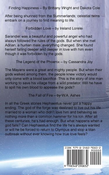 Finding Happiness - By Brittany Wright and Dakota Cole After being shunned from the Summerlands, celestial twins embark on a journey to find meaning to life. Forbidden Love - by Ireland Lorelei Sarandiel was a beautiful and powerful angel who had always followed the rules of the gods. But when she met Adrian, a human male, everything changed. She found herself falling deeper and deeper in love with him even though it was forbidden by the gods. The Legend of the Phoenix - by Cassandra Joy The Mayans were a great and mighty people. But when their gods walked among them, the people knew victory would only come with a blood sacrifice. This is the story of one man working to save his village from a wild predator. Will he have to spill his own blood to appease the gods? The Fall of Fire - by W.A. Ashes In all the Greek stories Hephaestus never got a happy ending. The god of the forge was destined to live out his life married to a woman who didn't love him and behaving as nothing more than a common hammer for his kin. After all these centuries, he's had enough. But what happens when a god falls? Can Hephaestus find the life he's always wanted or will he be forced to return to Olympus and stop a titan outbreak without ever knowing how true love feels?