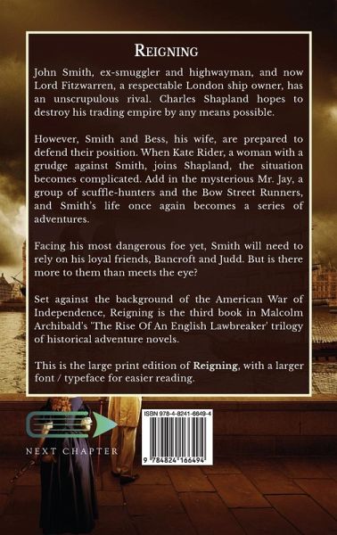 John Smith, ex-smuggler and highwayman, and now Lord Fitzwarren, a respectable London ship owner, has an unscrupulous rival. Charles Shapland hopes to destroy his trading empire by any means possible. However, Smith and Bess, his wife, are prepared to defend their position. When Kate Rider, a woman with a grudge against Smith, joins Shapland, the situation becomes complicated. Add in the mysterious Mr. Jay, a group of scuffle-hunters and the Bow Street Runners, and Smith's life once again becomes a series of adventures. Facing his most dangerous foe yet, Smith will need to rely on his loyal friends, Bancroft and Judd. But is there more to them than meets the eye? Set against the background of the American War of Independence, Reigning is the third book in Malcolm Archibald's 'The Rise Of An English Lawbreaker' trilogy of historical adventure novels. This is the large print edition of Reigning, with a larger font / typeface for easier reading.