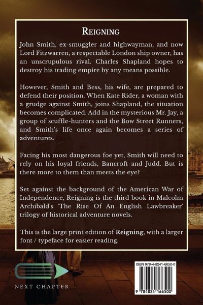 John Smith, ex-smuggler and highwayman, and now Lord Fitzwarren, a respectable London ship owner, has an unscrupulous rival. Charles Shapland hopes to destroy his trading empire by any means possible. However, Smith and Bess, his wife, are prepared to defend their position. When Kate Rider, a woman with a grudge against Smith, joins Shapland, the situation becomes complicated. Add in the mysterious Mr. Jay, a group of scuffle-hunters and the Bow Street Runners, and Smith's life once again becomes a series of adventures. Facing his most dangerous foe yet, Smith will need to rely on his loyal friends, Bancroft and Judd. But is there more to them than meets the eye? Set against the background of the American War of Independence, Reigning is the third book in Malcolm Archibald's 'The Rise Of An English Lawbreaker' trilogy of historical adventure novels. This is the large print edition of Reigning, with a larger font / typeface for easier reading.