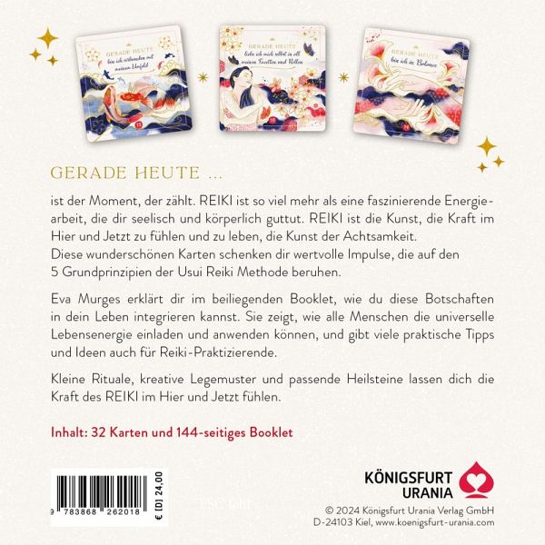 Gerade heute ...ist der Moment, der zählt. REIKI ist so viel mehr als eine faszinierende Energiearbeit, die dir seelisch und körperlich guttut. REIKI ist die Kunst, die Kraft im Hier und Jetzt zu fühlen und zu leben, die Kunst der Achtsamkeit.Diese wunderschönen Karten schenken dir wertvolle Impulse, die auf den 5 Grundprinzipien der Usui Reiki Methode beruhen. Eva Murges erklärt dir im beiliegenden Booklet, wie du diese Botschaften in dein Leben integrieren kannst. Sie zeigt, wie alle Menschen die universelle Lebensenergie einladen und anwenden können, und gibt viele praktische Tipps und Ideen auch für Reiki-Praktizierende. Kleine Rituale, kreative Legemuster und passende Heilsteine lassen dich die Kraft des REIKI im Hier und Jetzt fühlen.