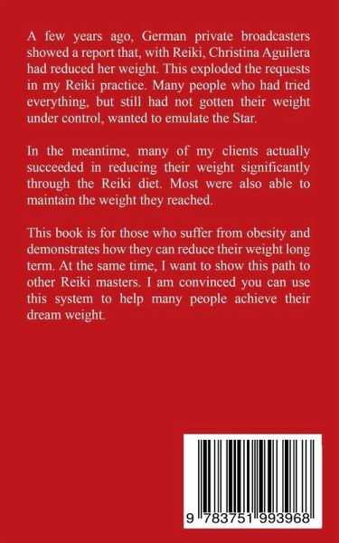 A few years ago, German private broadcasters showed a report that, with Reiki, Christina Aguilera had reduced her weight. This exploded the requests in my Reiki practice. Many people who had tried everything, but still had not gotten their weight under control, wanted to emulate the Star.In the meantime, many of my clients actually succeeded in reducing their weight significantly through the Reiki diet. Most were also able to maintain the weight they reached.This book is for those who suffer from obesity and demonstrates how they can reduce their weight long term. At the same time, I want to show this path to other Reiki masters. I am convinced you can use this system to help many people achieve their dream weight.