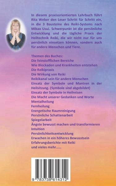 In diesem praxisorientierten Reiki-Lehrbuch führt Rita Weber den Leser Schritt für Schritt ein, in die 3 Bausteine des Reiki-Systems nach Mikao Usui. Schwerpunkt ist die persönliche Entwicklung durch die tägliche Heilmeditation mit der universellen Energie des Lebens.Weitere Themen des Buches:Die feinstofflichen BereicheIntuitionWie Blockaden und Krankheiten entstehenDie ReikipraxisDie Wirkung von ReikiReikikanal sein für andere MenschenEinsatz der Symbole und Mantren in der Heilmeditation. (Symbole sind abgebildet)Einsatz der Symbole in HeilreisenDie Macht unserer Gedanken und WorteMentalheilungFernheilungEnergetische RaumreinigungPersönliche SchattenarbeitSpiegelarbeitÄngste bewusst machen und transformierenPersönlichkeitsentwicklungErwachen in ein höheres BewusstseinErfahrungsberichte mit Reiki